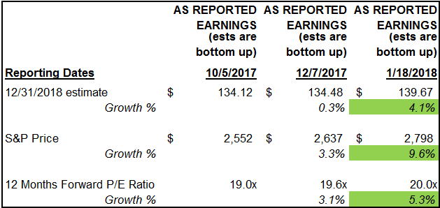 Today’s earnings estimate for 2018 is indeed higher than the $134.48 estimate on 12/7/2017, prior to the tax bill’s finalization. This equates to a 3.7% increase since the passing of the bill, and a 4.1% change since October, as it does look like earnings are getting some boost from the tax changes. How much of this is the actual result of taxes, it’s impossible to know for sure, but the jump in EPS does look at least partially driven by taxes. But just as important as earnings, price has been rising even faster than EPS, as highlighed in green.