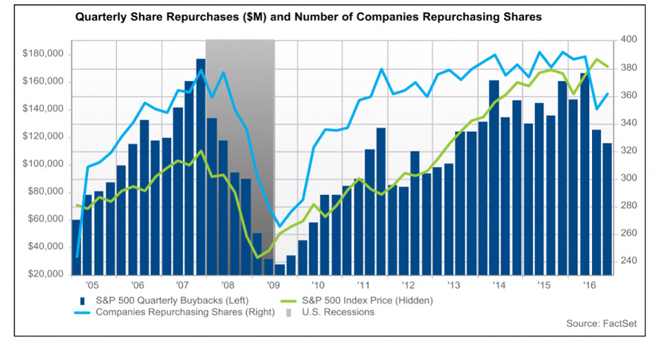 The chart below shows the dollar amount of buybacks by S&P 500 companies in dark blue, the number of companies repurchasing shares in a lighter blue, and the S&P 500 in green.