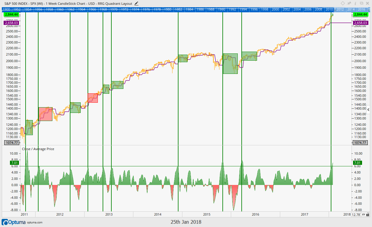 So, what does it mean? It means the market is stretched here. It has probably run too far too fast and could succumb to the powers of mean reversion. It also does not necessarily mean a market decline is around the corner. Note this indicator reading >7% occurred prior to the largest pullback during the timespan, the late 2015 top that culminated with the 2016 low, but the market being more than 7% away from the prior month’s average price also occurred in 2011, resulting in just a small pullback of a few percent.
